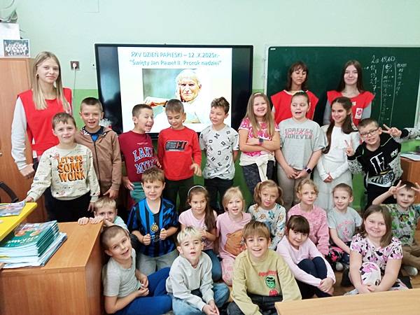 W naszej szkole wolontariusze przybliżyli uczniom klas młodszych osobę św. Jana Pawła II - prezentacja multimedialna. Spotkanie zakończyło się pytaniami na temat tego świętego.