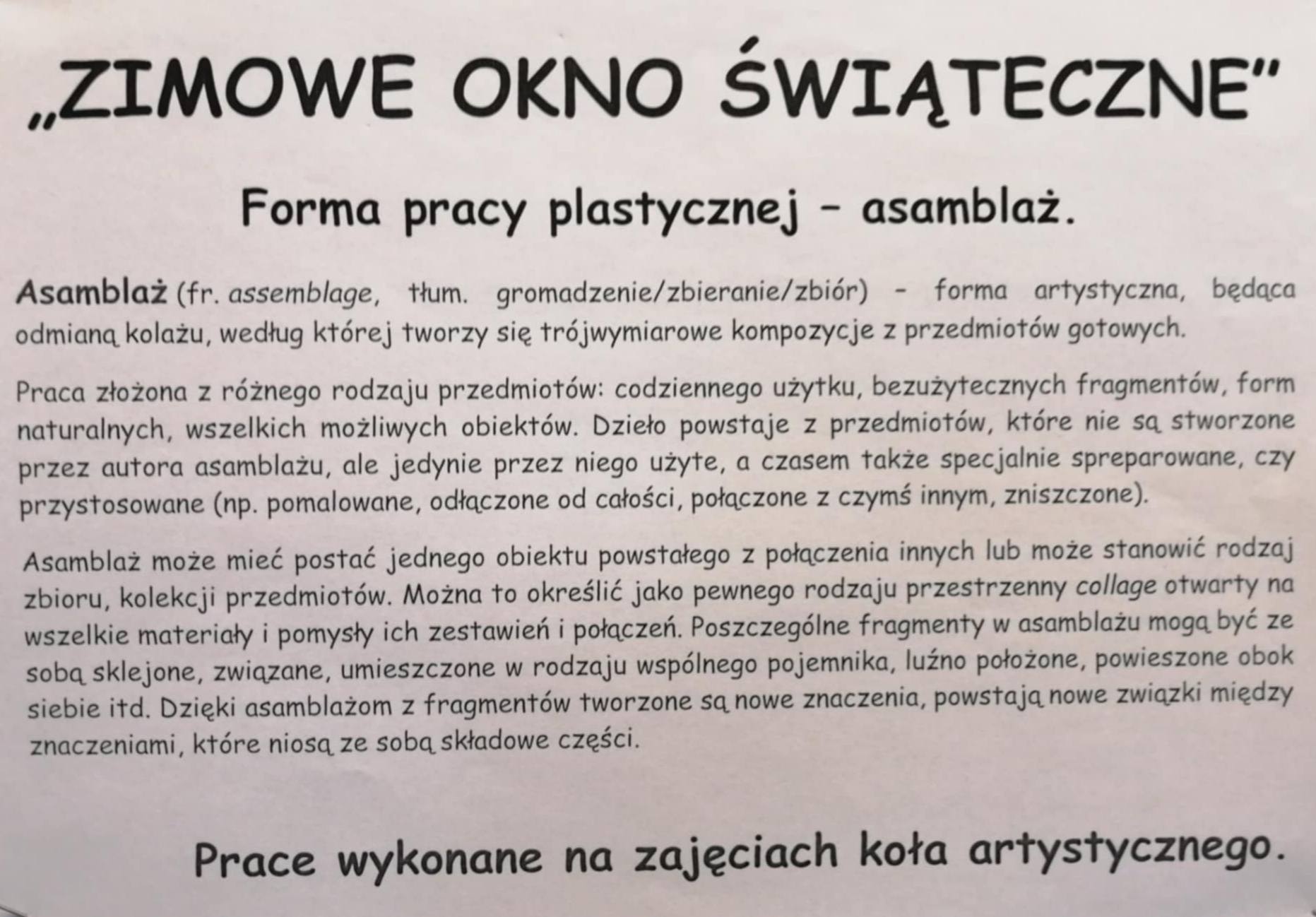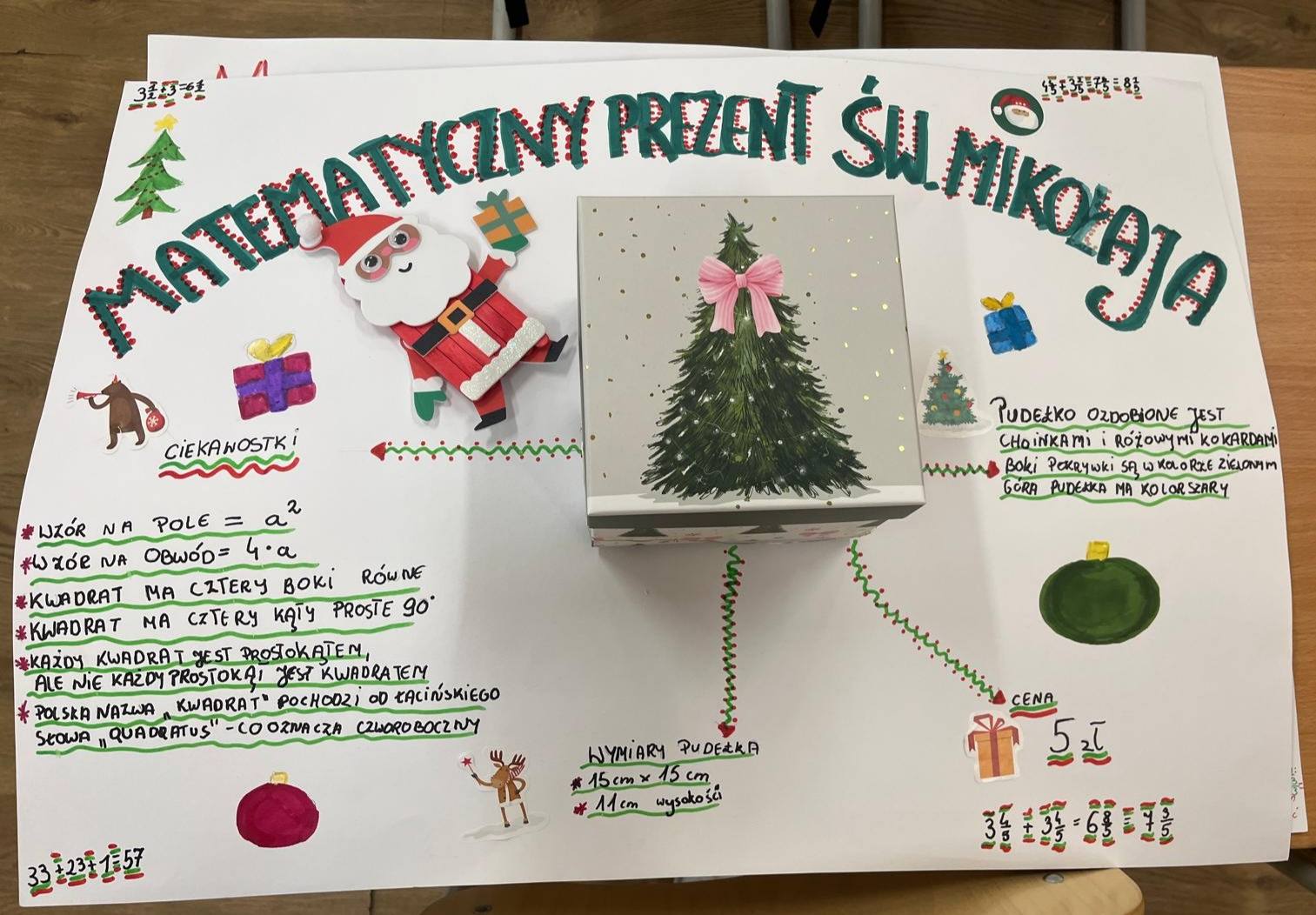 Mieli oni za zadanie przygotować matematyczny prezent (przestrzenną figurę geometryczną) przyklejony do kartki, na której opisano wszystkie matematyczne informacje na jego temat w wydaniu świątecznym.