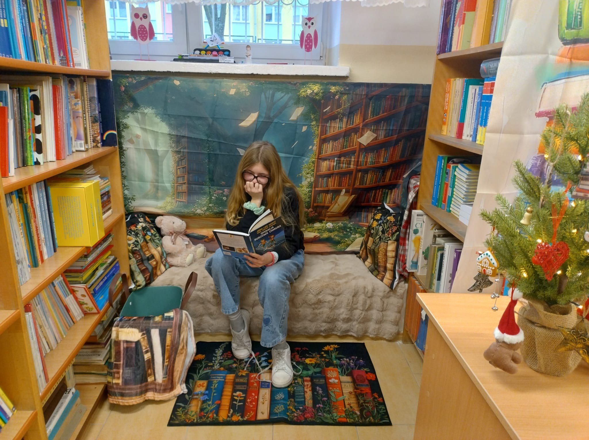 Natomiast 9 i 10 grudnia 2025 r. wolontariusze włączyli się w organizację nowego kącika czytelniczego - miejsca przeznaczonego dla osób potrzebujących ciszy, spokoju , pragnących oddać się w skupieniu lekturze ulubionej książki. Przestrzeń została odpowiednio przygotowana i wyposażona w wygodne miejsce do siedzenia i przytulne dodatki. Uczniowie zadbali również o świąteczny wystrój biblioteki, nadając jej przyjazny i ciepły klimat sprzyjający czytaniu.