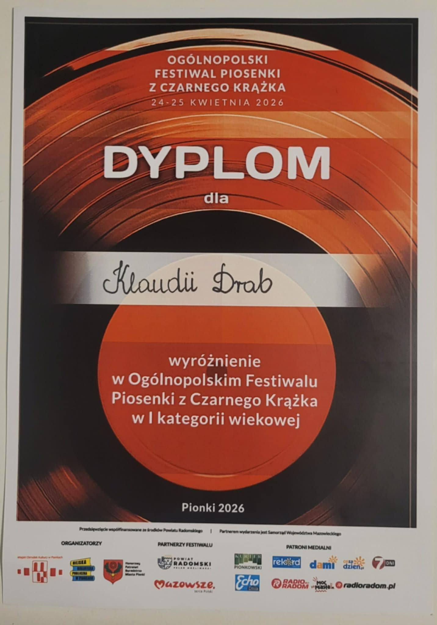 Klaudia Drab, uczennica kl. 8b, zdobyła wyróżnienie na 7. Ogólnopolskim Festiwalu Piosenki ,, Z czarnego krążka ".