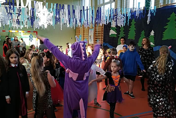 W tym dniu przenieśliśmy się do WIELKIEJ KRAINY BAJEK. Dzieci z klas I-III zamienili się w różne postacie. Były wróżki, księżniczki, policjanci, kowboje, Spider-Mani, biedronki, kotki i wiele innych bajkowych i książkowych postaci. Przebierańcy świetnie się bawili, uczestnicząc we wspólnych zabawach i konkursach, a skoczna i rytmiczna muzyka zachęcała do tańca. Wolontariusze ze Szkolnego Koła Caritas pomagali dzieciom w hulankach. Wszystkim zabawom towarzyszyła radość, śmiech i spontaniczna aktywność dzieci, a cały bal karnawałowy przebiegł w miłej, serdecznej atmosferze i dostarczył niezapomnianych wrażeń.