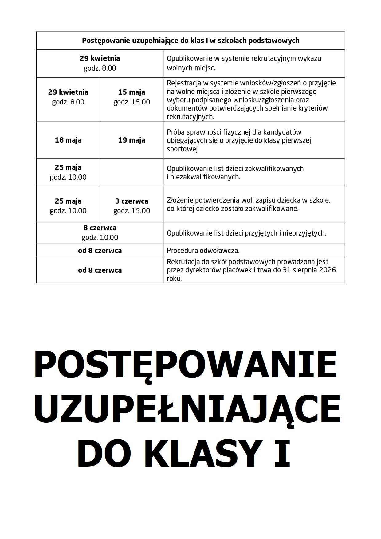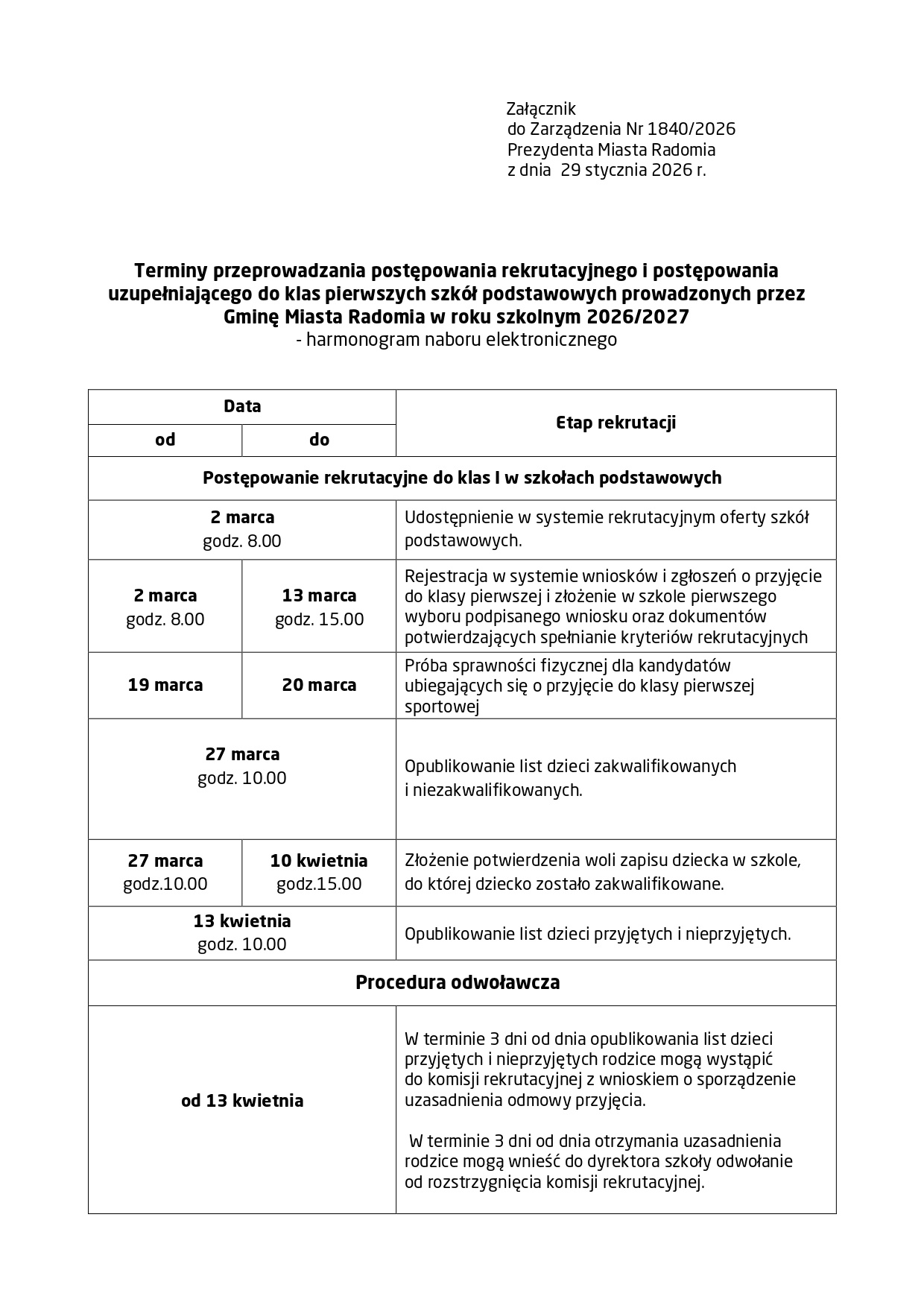 Terminy przeprowadzania postępowania rekrutacyjnego i postępowania uzupełniającego do klas pierwszych szkół podstawowych prowadzonych przez Gminę Miasta Radomia w roku szkolnym 2026/2027.