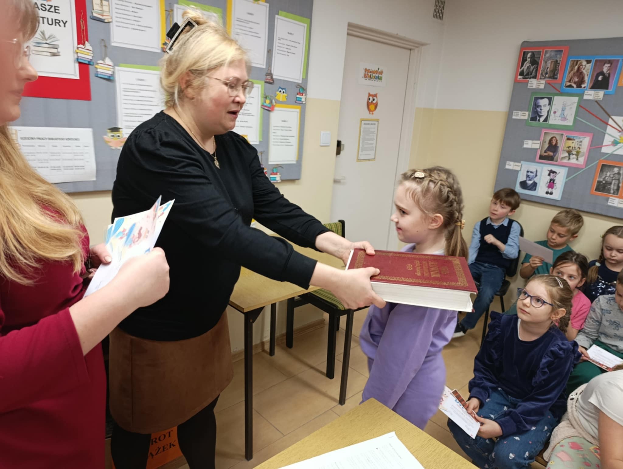 To ważny moment w życiu każdego młodego czytelnika, który po raz pierwszy oficjalnie zostaje przyjęty do grona użytkowników biblioteki szkolnej. Na początku spotkania uczniowie zostali zaznajomieni z krótką historią książki, dowiedzieli się, że biblioteka to miejsce, w którym każdy może znaleźć coś ciekawego dla siebie - bajkę, opowieść przygodową czy książkę popularnonaukową. Zapoznali się również zasadami korzystania z biblioteki szkolnej; uświadomili sobie, że książki należy szanować, aby mogły przez długie lata służyć innym.